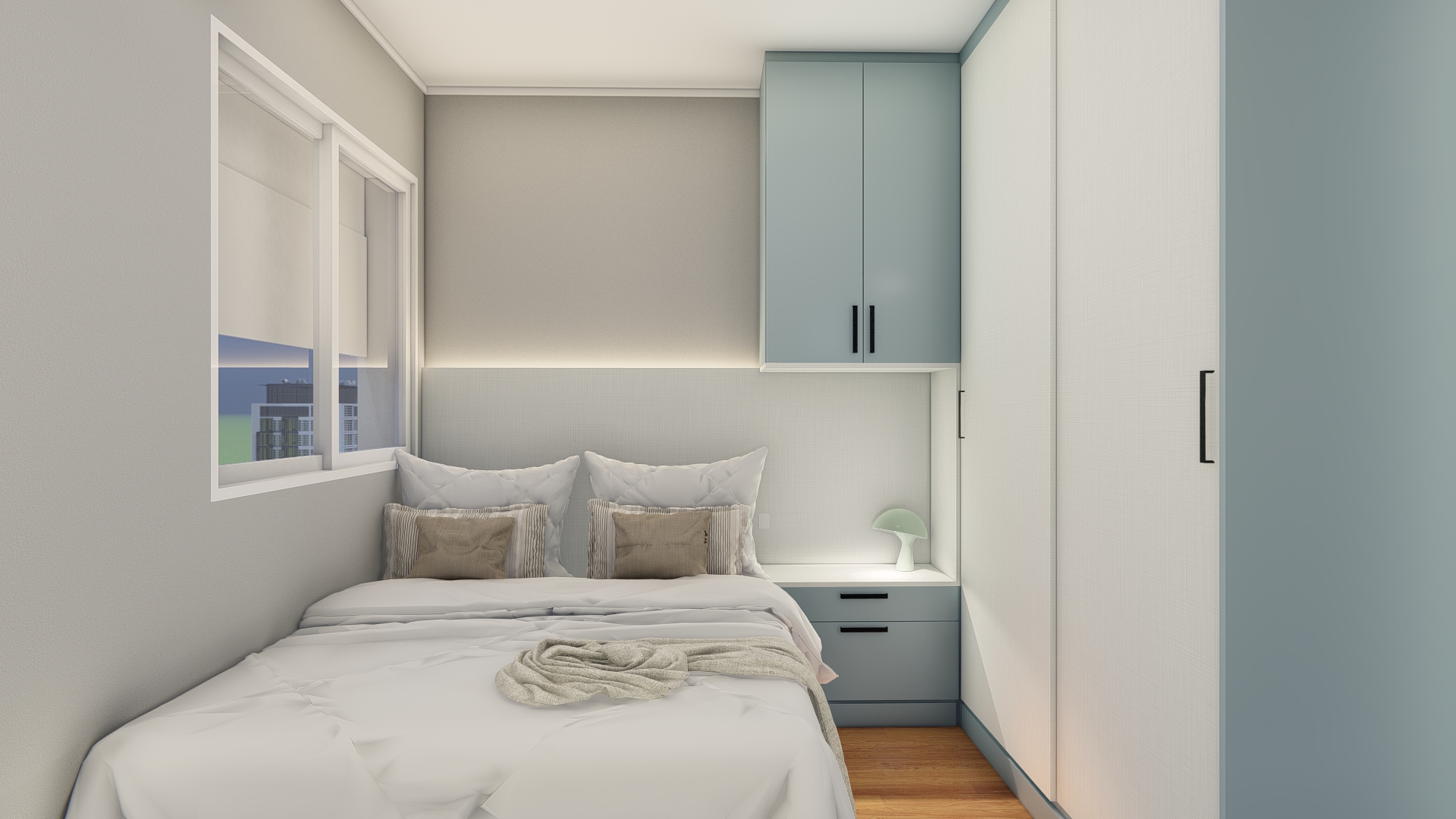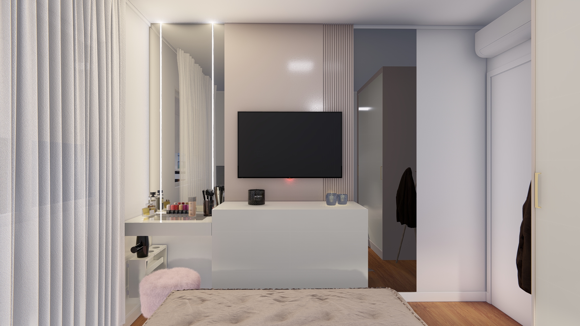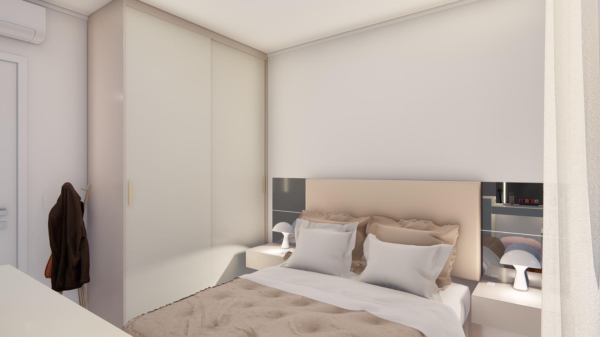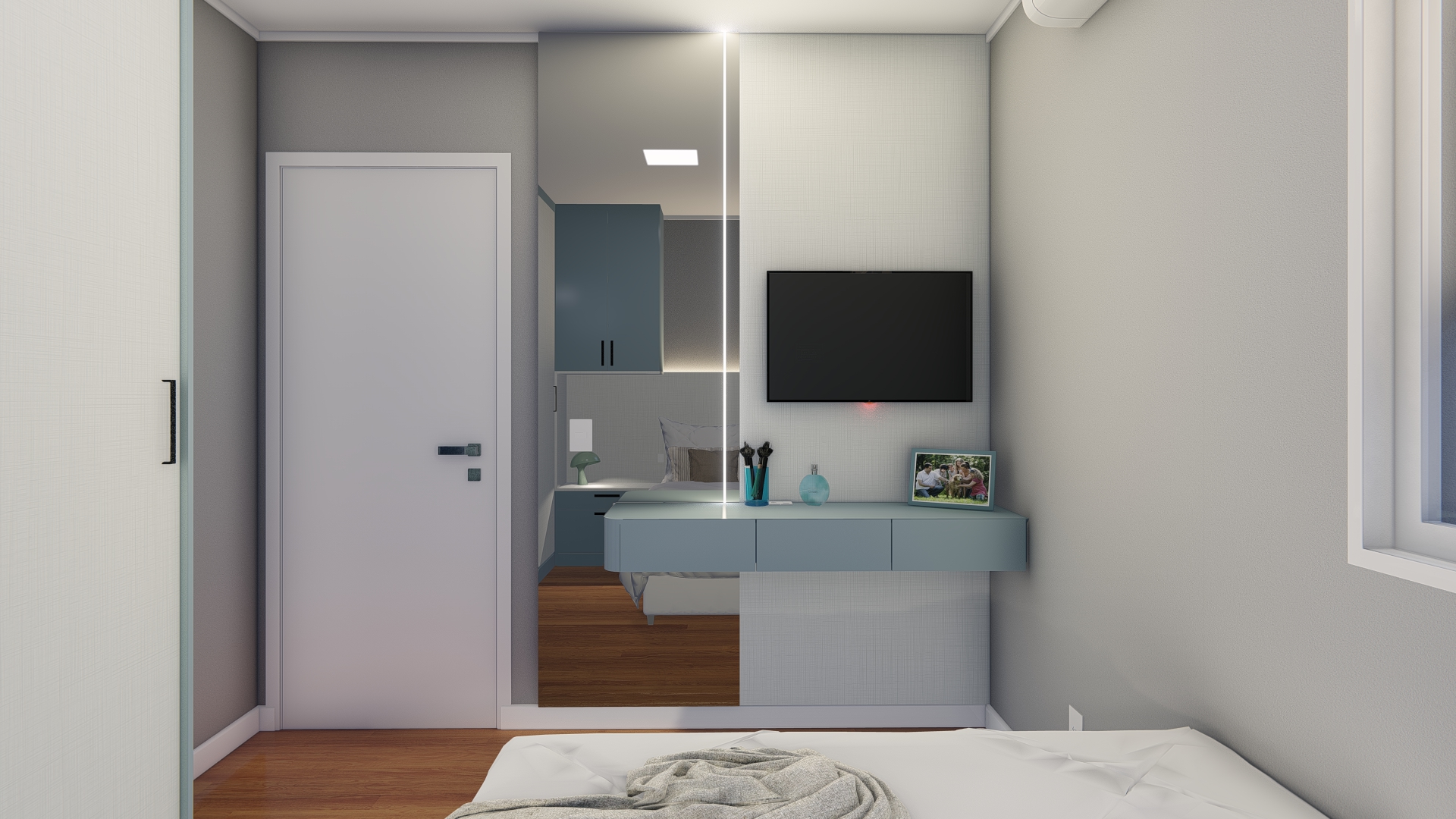 Pensando na acessibilidade, adaptamos um dos dormitórios para garantir conforto e praticidade a uma pessoa com dificuldades de locomoção. Em outro dormitório, criamos soluções inteligentes de armazenamento, incluindo uma cômoda que oculta um cabideiro e uma penteadeira elegante e funcional.