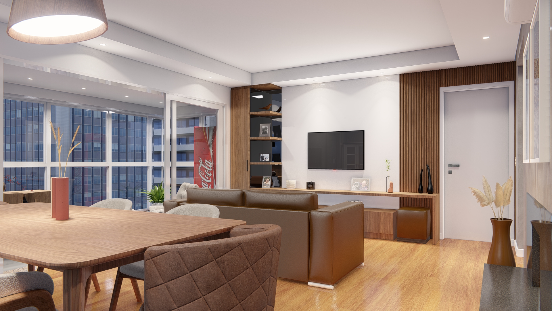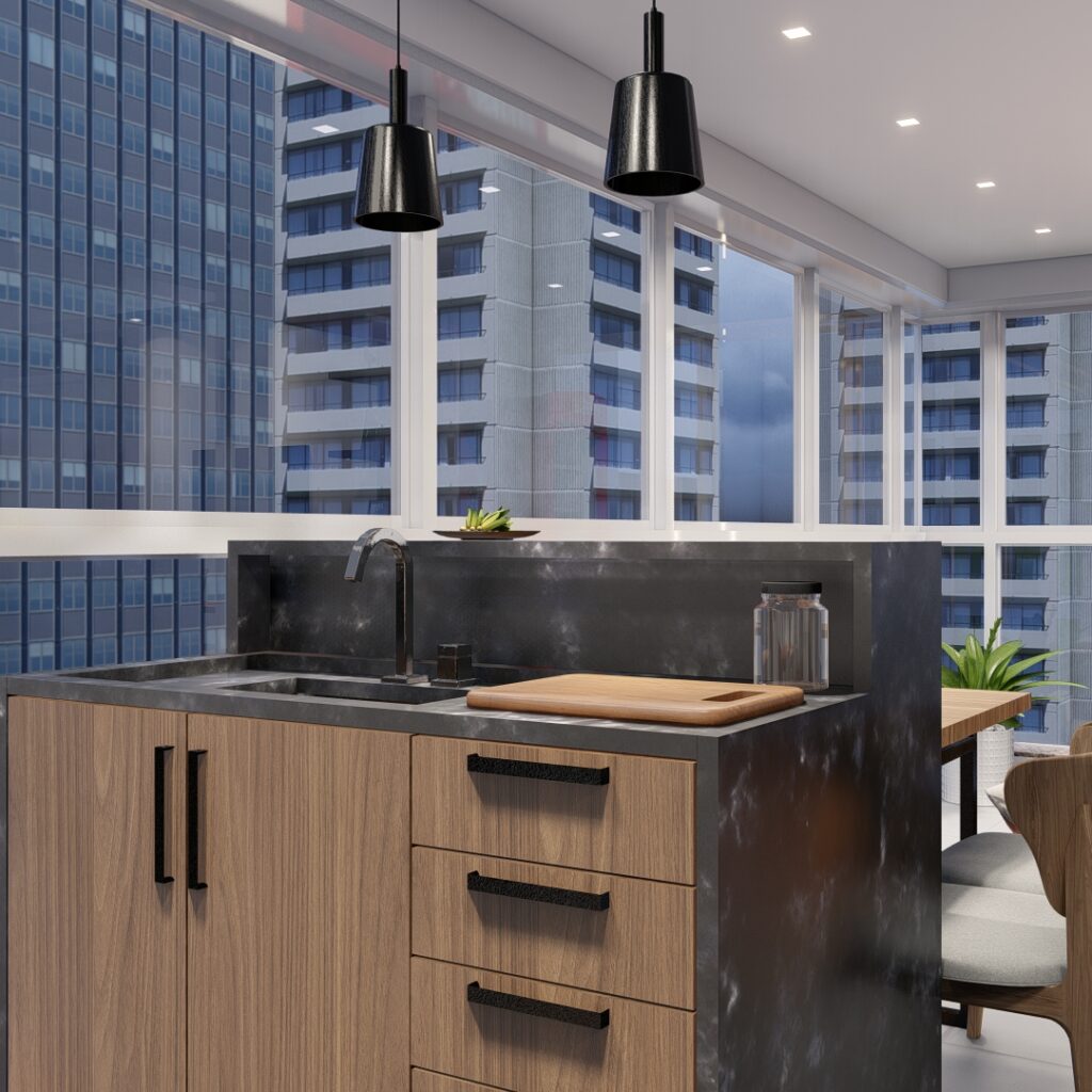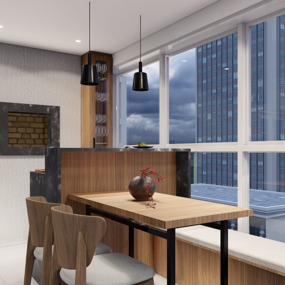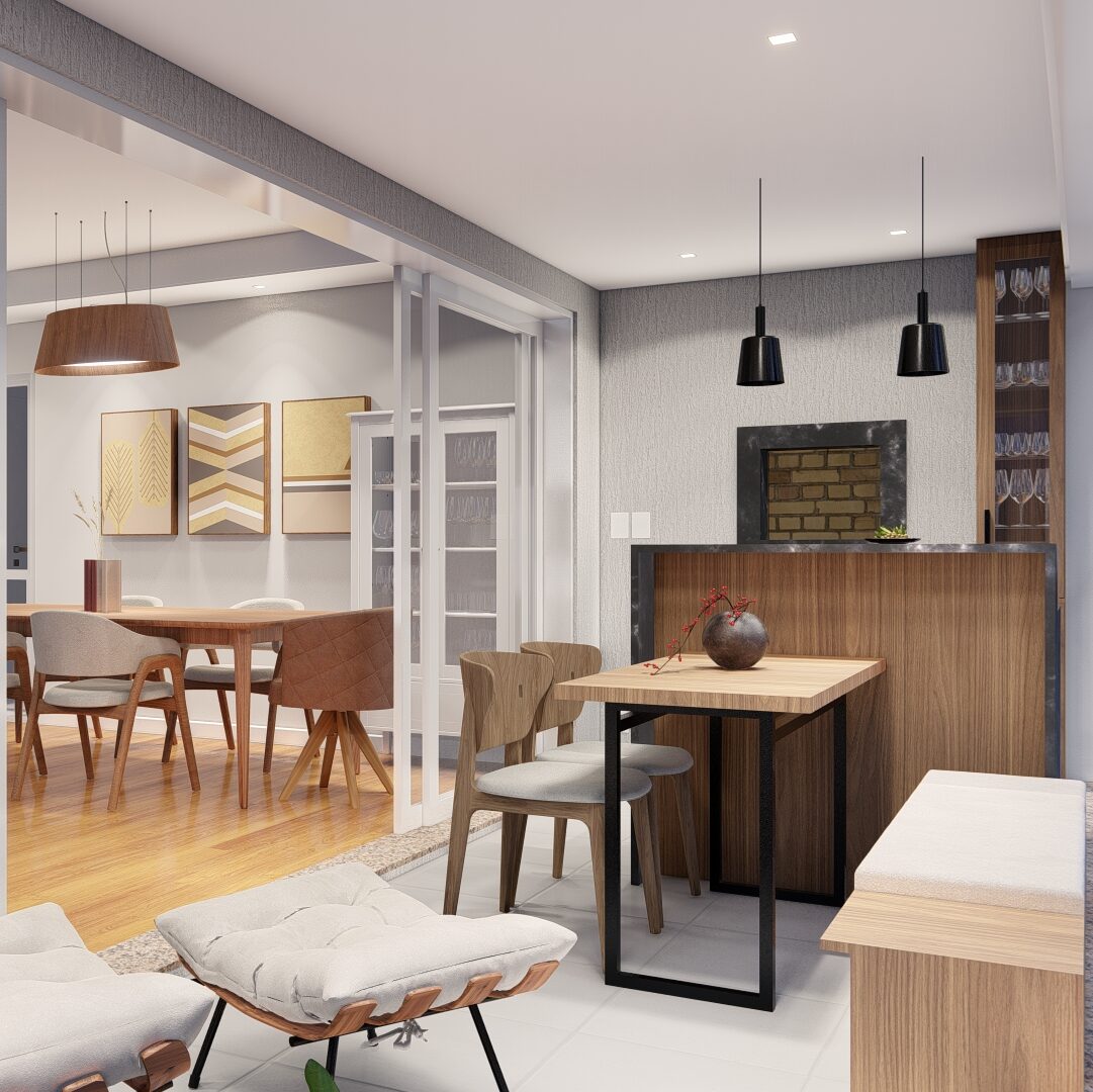 Na sala de estar, modernizamos o ambiente com um novo painel e uma paleta de cores que realça o espaço, trazendo um toque contemporâneo e acolhedor ao apartamento. A sacada foi projetada como uma extensão da área de estar e jantar, com uma churrasqueira, inserimos uma bancada com pia e uma mesa com cadeiras, ideal para receber amigos e familiares em um ambiente de interação e descontração.