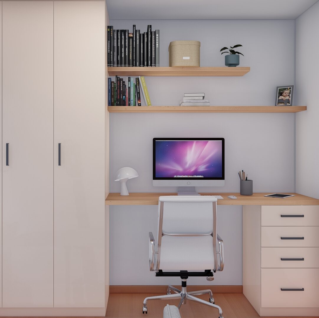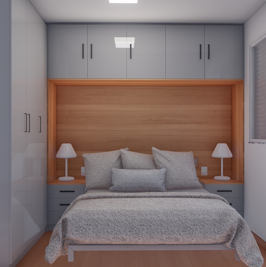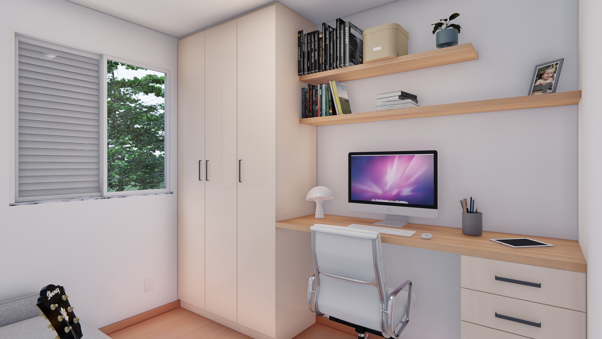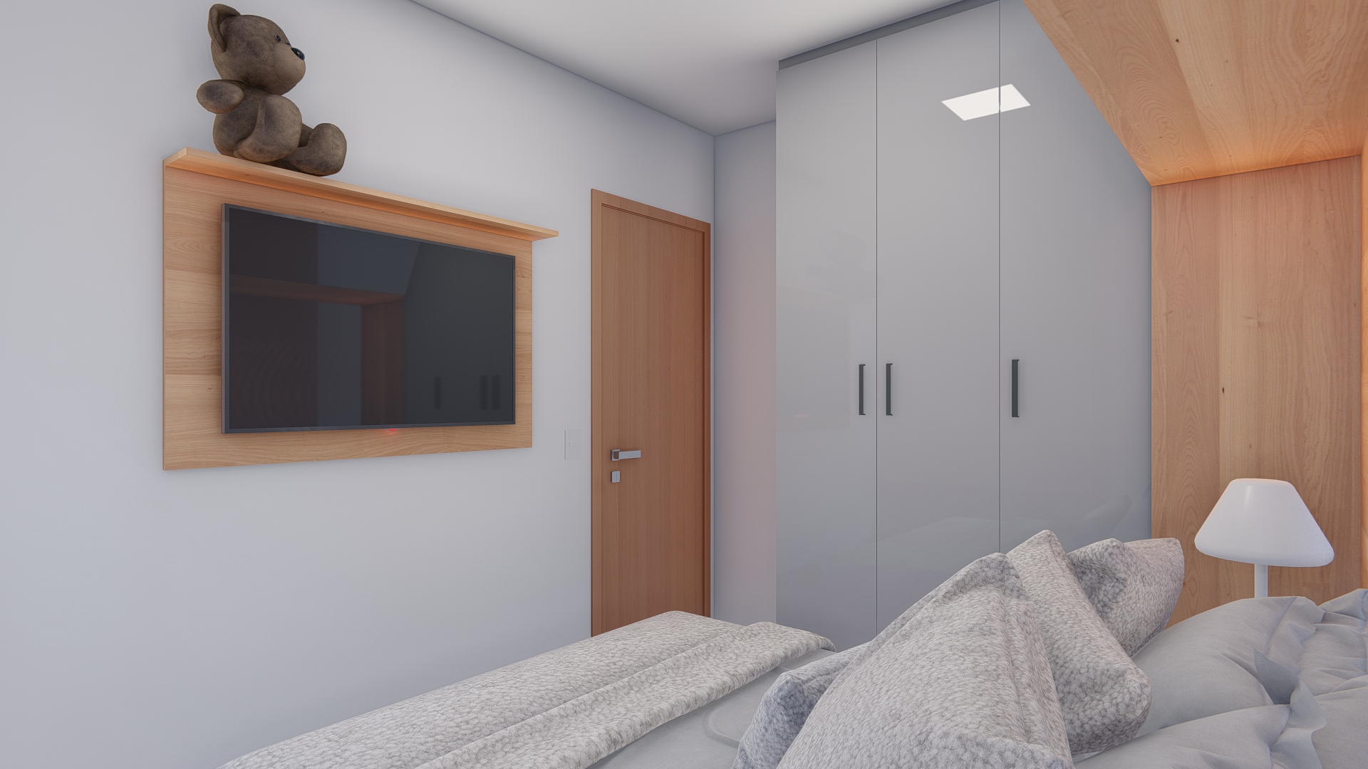 Para permitir uma execução flexível e econômica, os ambientes foram projetados para serem concluídos de forma independente. O dormitório principal foi planejado com soluções inteligentes de armazenamento, maximizando o espaço disponível. O segundo dormitório foi idealizado como um espaço multifuncional, com potencial para servir como escritório, extensão do closet, quarto de hóspedes e, futuramente, até mesmo um quarto infantil.