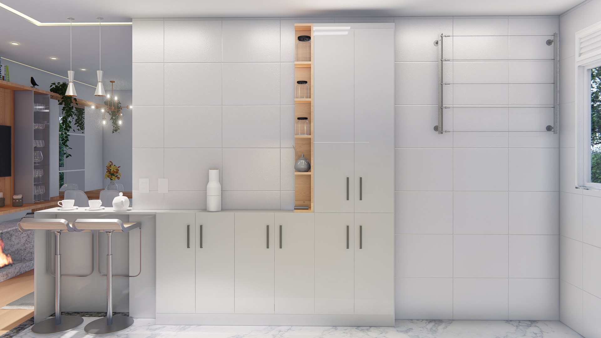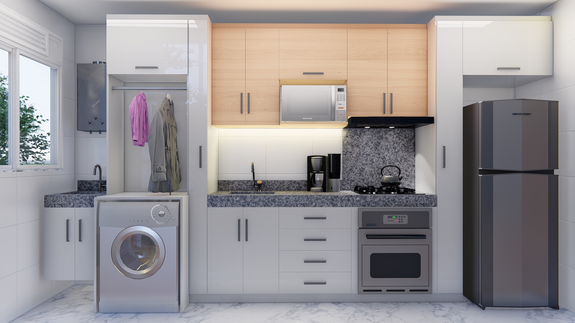 Na cozinha, todos os móveis foram ajustados de acordo com as pedras da pia e do tanque da lavanderia, proporcionando um aproveitamento eficiente dos espaços e facilitando a organização e a limpeza. O ambiente do living foi cuidadosamente projetado para criar uma sensação de amplitude, acolhendo também as visitas com conforto. A área de jantar se integra harmoniosamente com a pequena sacada com churrasqueira, ampliando o espaço social e promovendo um ambiente de interação.