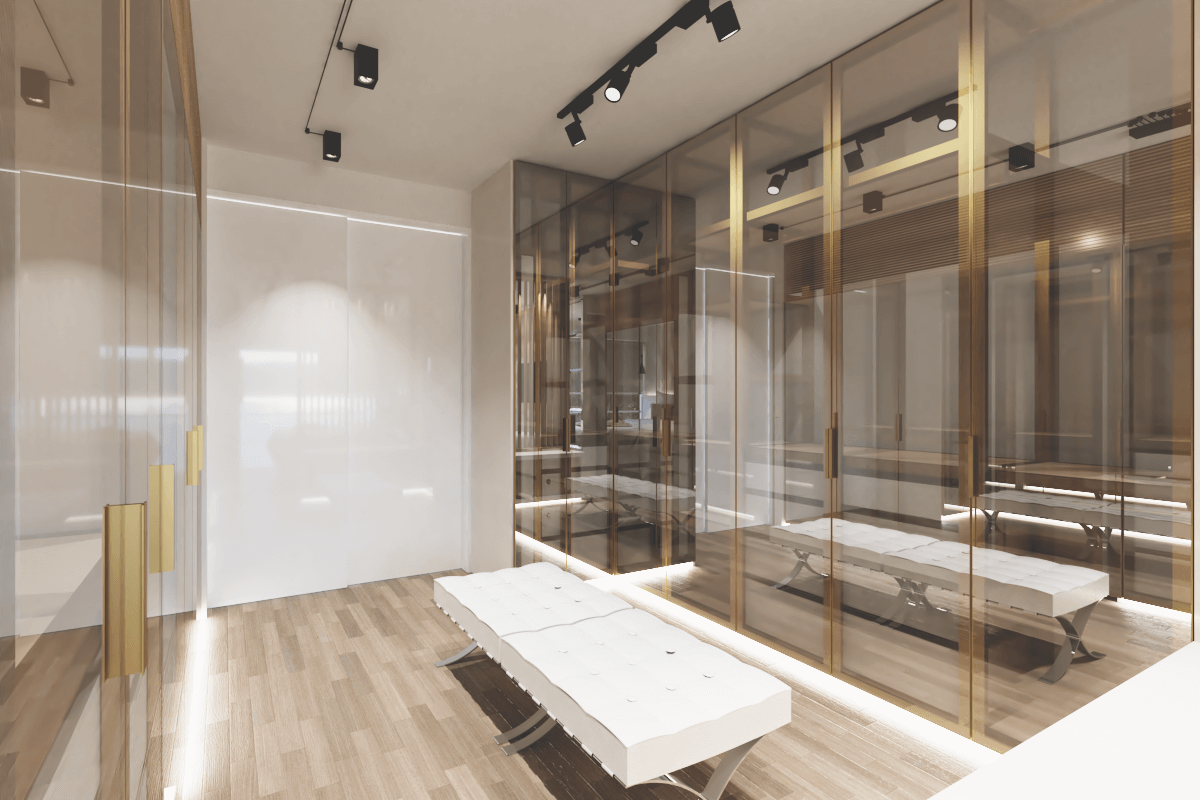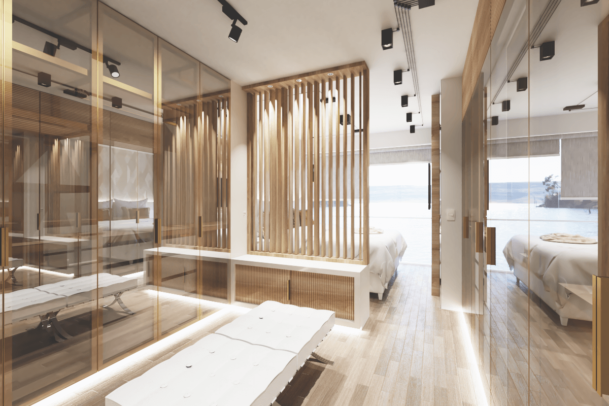 Reimaginamos completamente o layout da suíte para atender a essas necessidades específicas. Criamos um novo e sofisticado closet localizado no acesso ao quarto, oferecendo amplas opções de armazenamento para roupas, sapatos, bolsas, joias e acessórios. O closet inclui um módulo móvel que pode ser reconfigurado conforme a necessidade, proporcionando flexibilidade e praticidade no dia a dia.
