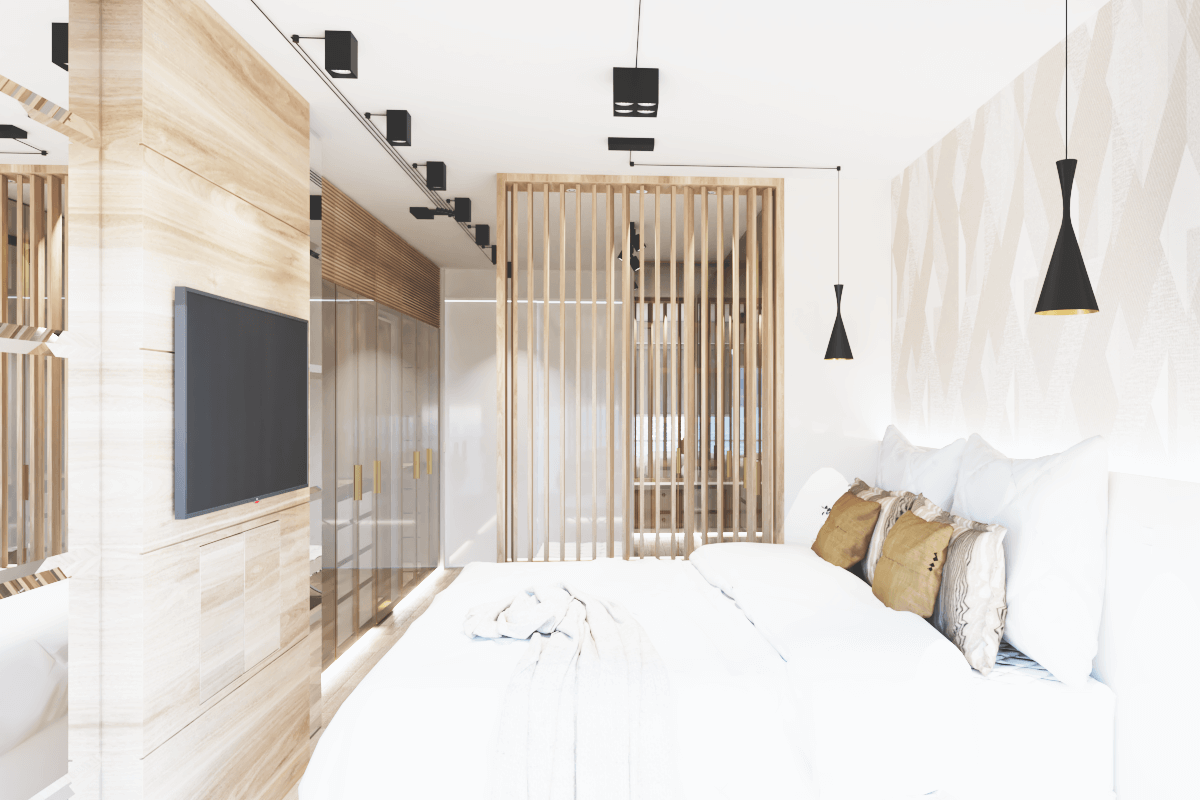 Integramos a sacada ao dormitório, ampliando significativamente o espaço e criando um ambiente mais arejado e confortável. Para aumentar a privacidade, projetamos um painel com brises móveis que divide elegantemente o espaço da cama, sem comprometer a sensação de amplitude.